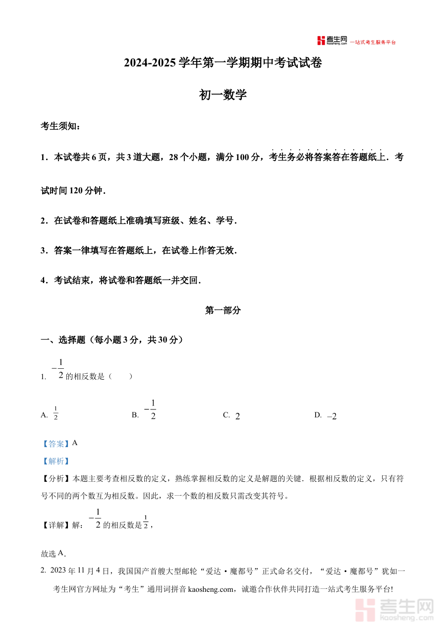 《精品解析:北京市第五十四中学2024-2025学年七年级上学期期中考试数学试卷(解析版)》是针对北京市第五十四中学特定学年及年级的期中数学考试所编制的配套备考资料,精准对应该校2024级七年级上学期的数学期中检测需求,为相关使用者提供与考试直接关联的解析内容支持。