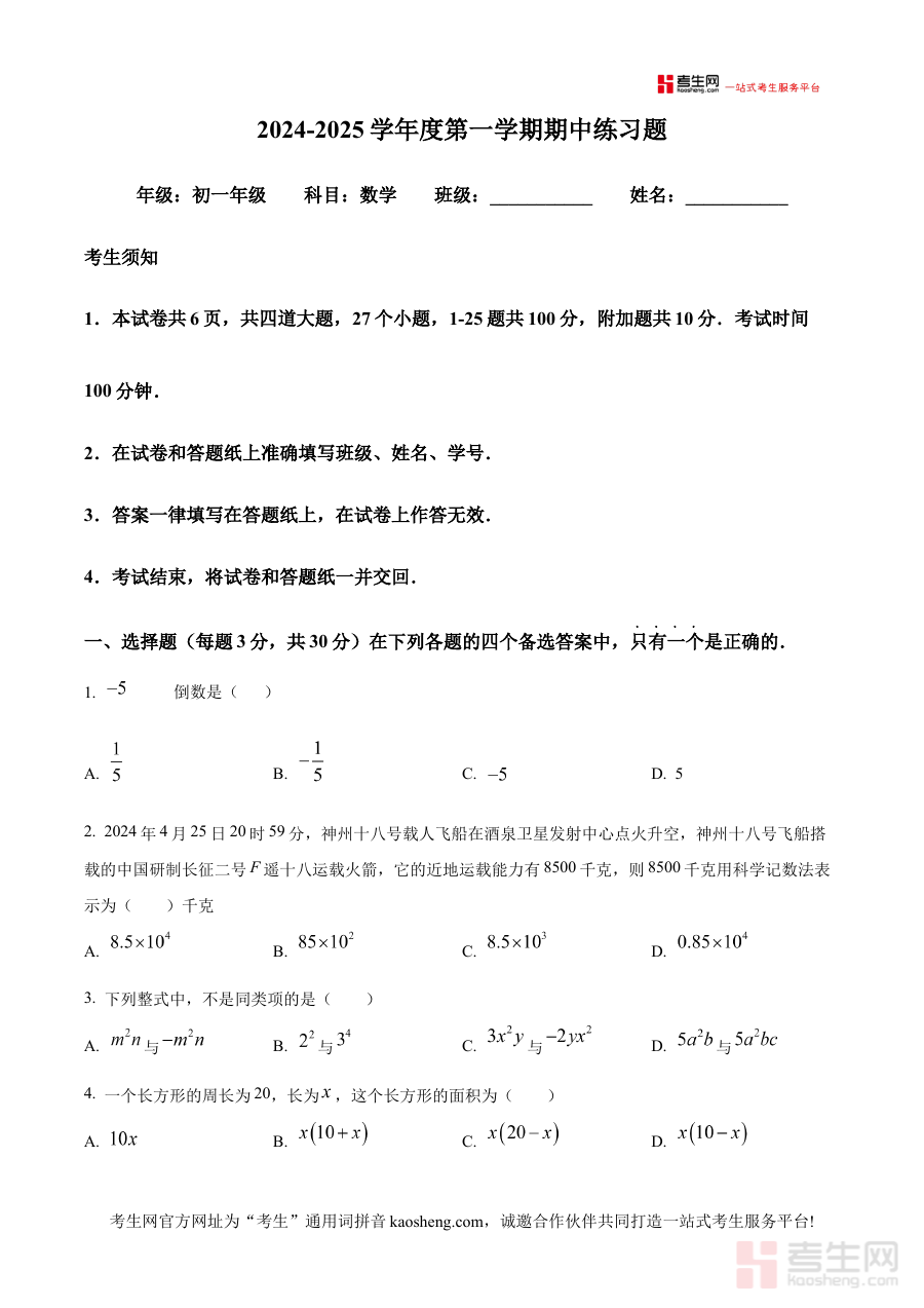 《精品解析:北京市第八中学2024-2025学年七年级上学期11月期中考试数学试题(原卷版)》是针对北京市第八中学2024-2025学年七年级上学期11月期中考试的数学学科备考资料,涵盖该阶段期中考试的原卷内容,为学生提供贴合本校教学进度与考试要求的复习载体。