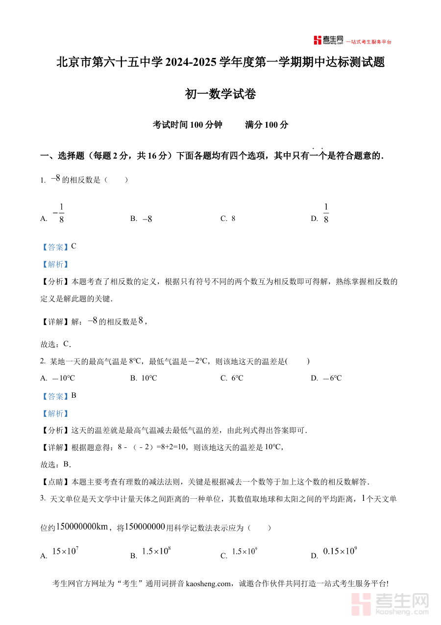 《精品解析:北京市第六十五中学2024-2025学年七年级上学期期中考试数学试卷(解析版)》是针对北京市第六十五中学2024至2025学年七年级上学期数学期中考试的专项备考资料,聚焦该阶段数学学习成果的检测需求,为使用者提供与本次考试直接关联的内容支持,助力把握考试核心方向。