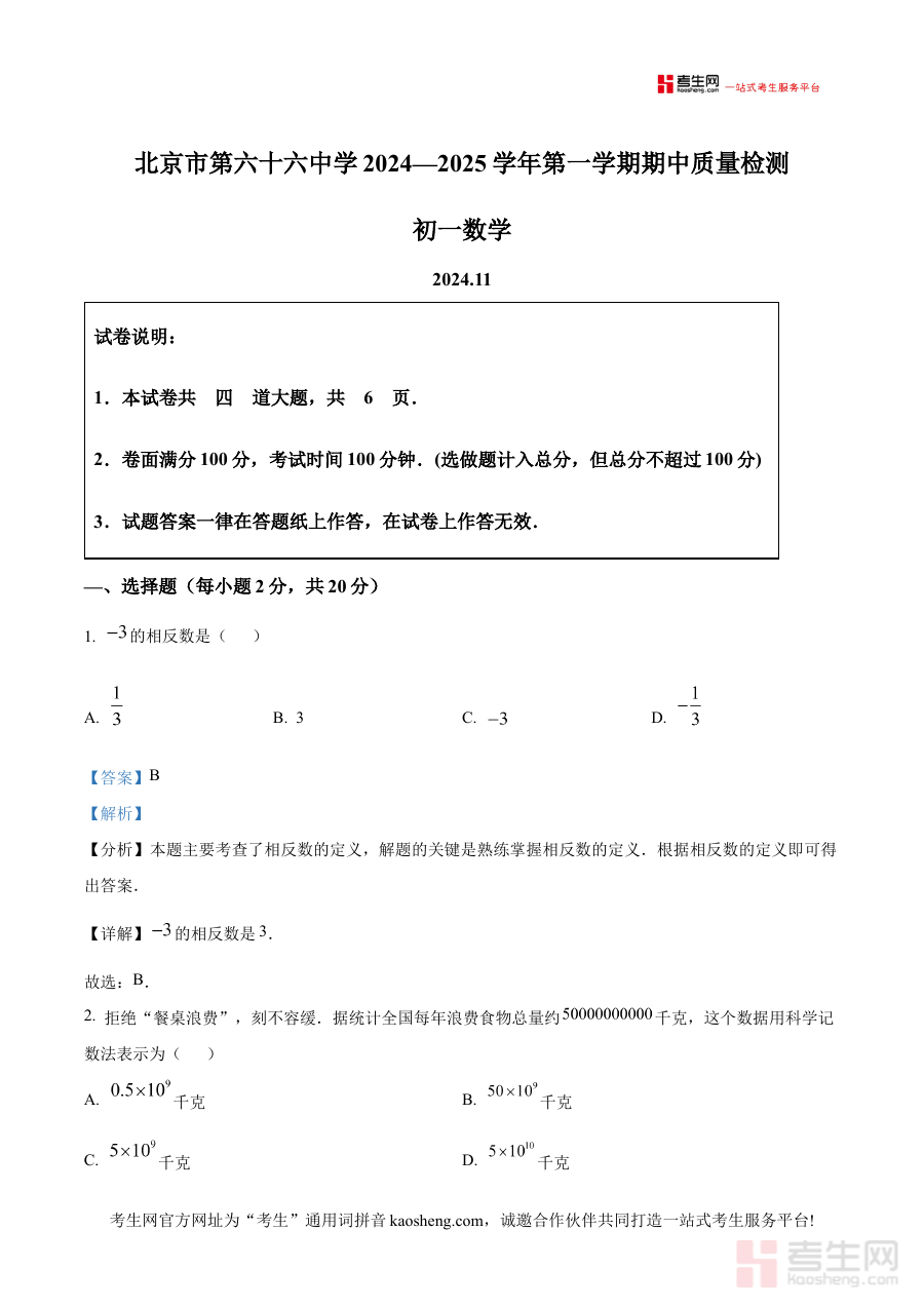 《精品解析:北京市第六十六中学2024-2025学年七年级上学期数学期中考试题 (解析版)》是针对北京市第六十六中学2024-2025学年七年级上学期数学期中考试的配套备考资料,精准匹配该阶段数学学科期中检测的需求,为相关使用者提供具有针对性的资源支持。
