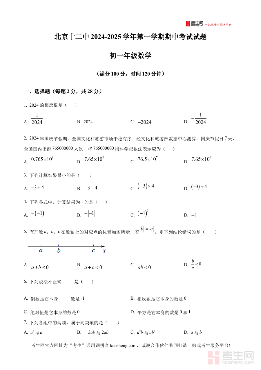 《精品解析:北京市第十二中学2024-2025学年七年级上学期期中数学试卷(原卷版)》是针对北京市第十二中学2024至2025学年七年级上学期数学期中考试的官方原卷资料,贴合该校该阶段教学进度与考试要求,为学生提供直观了解本次期中考试试卷结构与考查方向的载体,是七年级学生备战本次期中考试的重要参考素材,能帮助学生提前感知考试整体框架与命题风格,为后续复习安排提供清晰指引。
