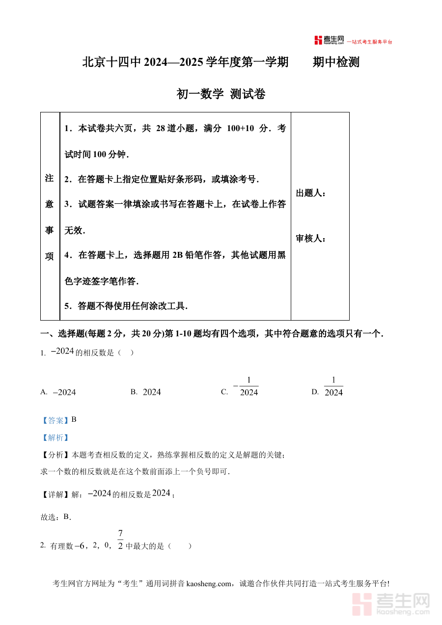 《精品解析:北京市第十四中学2024-2025学年七年级上学期数学期中考试题 (解析版)》是针对北京市第十四中学2024至2025学年七年级上学期数学期中考试的专业备考资料,精准匹配该学校该学年七年级上学期数学期中考查的具体需求,为使用者提供与本次考试直接关联的解析内容,助力其快速熟悉考试的整体结构与核心考查方向。