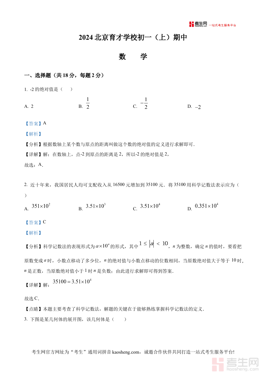 《精品解析:北京市育才学校2024-2025学年七年级上学期期中数学试题(解析版)》是针对北京市育才学校2024至2025学年七年级上学期期中数学考试的专业备考资料,结合该学年该阶段的教学进度与考试要求,聚焦期中阶段数学学习的核心内容与考核方向,为学生提供精准且全面的试题解析支持,助力学生熟悉考试形式与考查重点,为后续复习奠定基础。