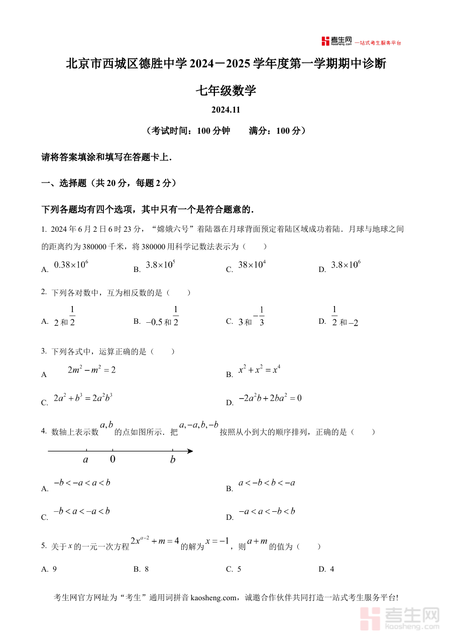《精品解析:北京市西城区德胜中学2024—2025学年七年级上学期10月期中数学试题(原卷版)》是针对北京市西城区德胜中学2024至2025学年七年级上学期10月期中考试的数学学科备考资料,精准匹配该阶段教学进度与考试要求,为学生提供与实际考试场景一致的试题呈现形式。