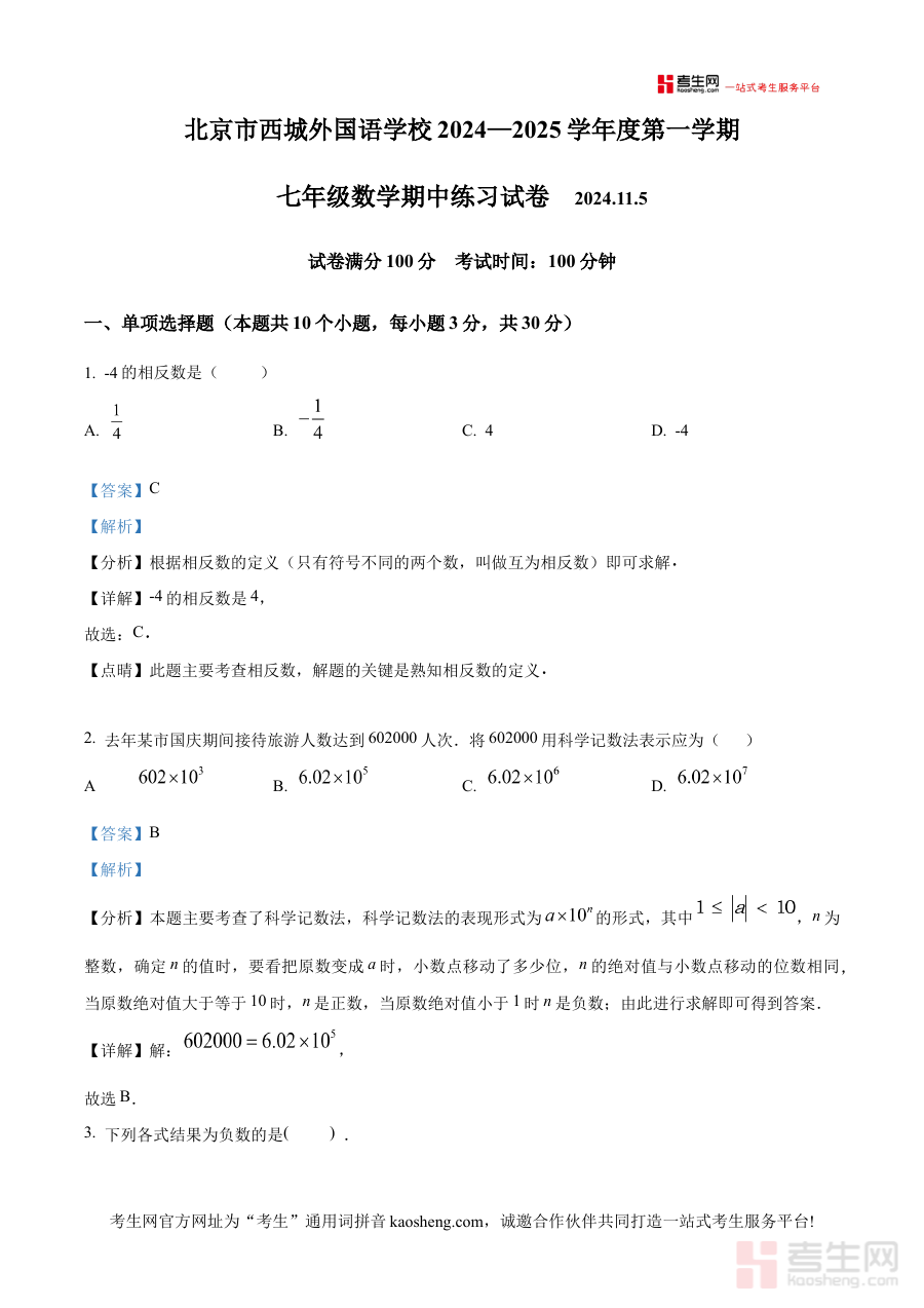 《精品解析:北京市西城外国语学校2024-2025学年七年级上学期期中考试数学试卷(解析版)》是针对北京市西城外国语学校2024至2025学年七年级上学期期中考试的数学学科备考资料,聚焦该阶段期中检测的核心需求,为相关使用者提供具有针对性的解析支持。