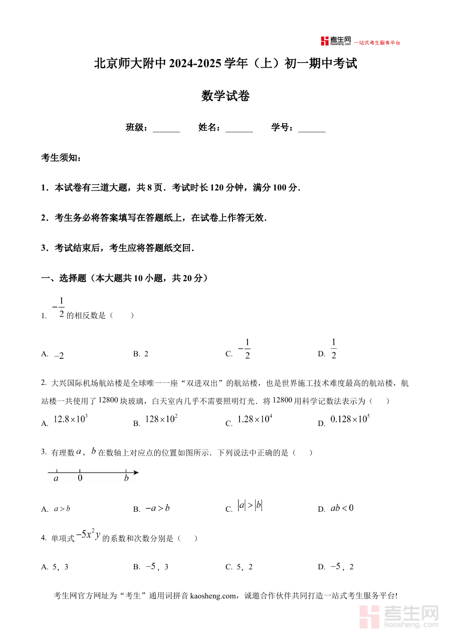 《精品解析:北京师范大学附属中学2024-2025学年七年级上学期期中数学试卷(原卷版)》是针对北京师范大学附属中学2024至2025学年七年级学生上学期期中数学考试的配套备考资料,依托该校该学年该阶段的数学教学进度与期中检测要求编制而成,能够精准反映该学校七年级数学期中考查的方向与范围,为学生提供贴合校情学情的练习载体。