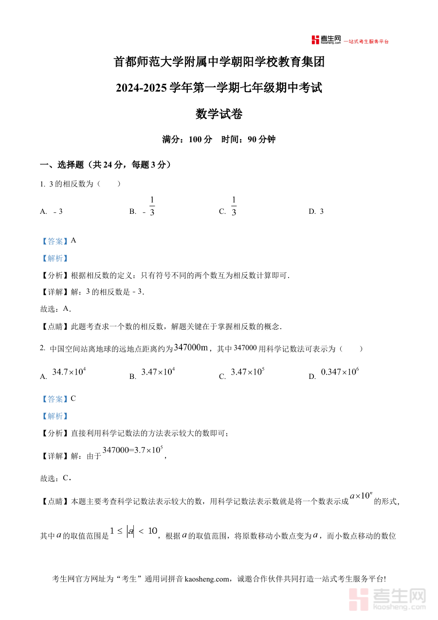 《精品解析:北京首都师范大学附属中学朝阳学校教育集团2024-2025学年七年级上学期期中考试数学试题(解析版)》是面向北京首都师范大学附属中学朝阳学校教育集团内七年级学生及教师的数学学科期中备考资料,精准对应2024至2025学年上学期中期的考试需求,贴合该教育集团的教学进度与考试命题标准,为使用者提供与本地校际实际教学场景高度匹配的参考依据。