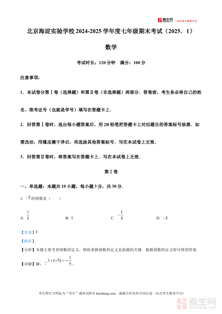 《精品解析:北京实验学校(海淀)2024-2025学年七年级上学期数学期末试卷(解析版)》是针对北京海淀区北京实验学校2024-2025学年七年级上学期数学期末考试的配套备考资料,精准对应该阶段数学学科的期末考核场景,为使用者提供与本次考试直接相关的专业解析支持。