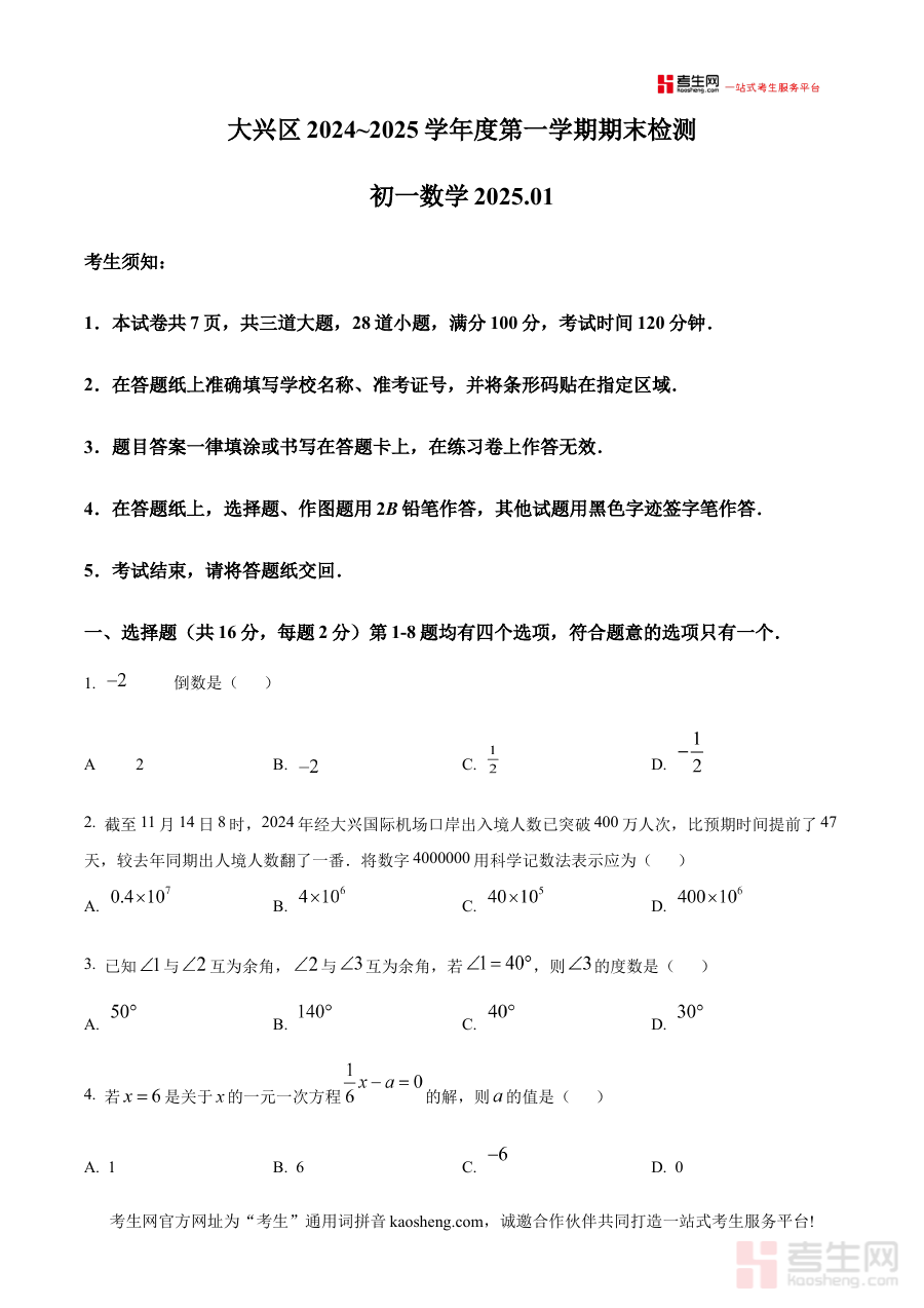 《精品解析:北京市大兴区2024~2025学年上学期期末检测 七年级数学试题(原卷版)》是面向北京市大兴区七年级学生设计的、对应2024至2025学年第一学期期末数学检测的专业备考资料。它严格贴合该地区当学期的数学教学大纲与期末评价要求,完整呈现了本地期末检测的命题框架与考试形式,为使用者提供了与实际考试高度一致的参考样本,助力使用者快速掌握本地期末检测的核心导向。