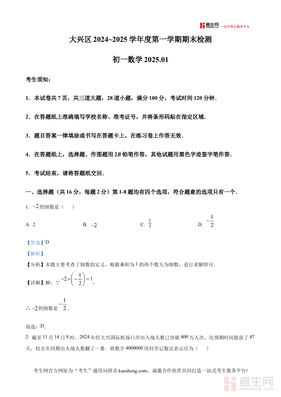 《精品解析:北京市大兴区2024~2025学年上学期期末检测 七年级数学试题(解析版)》是针对北京市大兴区2024至2025学年第一学期七年级数学期末检测的专业备考资料,聚焦该区域该学段数学学科的期末考核需求,为使用者提供与本地考试方向匹配的解析支持。