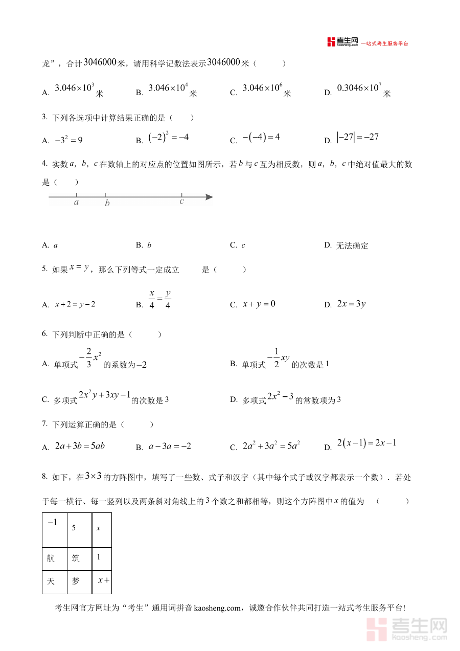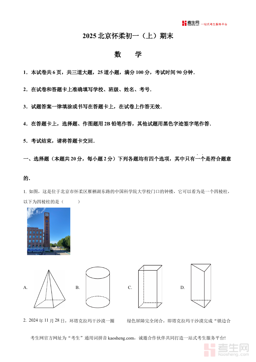 《精品解析:北京市怀柔区2024-2025学年七年级上学期期末考试数学试卷 (原卷版)》是针对北京市怀柔区2024-2025学年七年级上学期数学期末考试设计的备考资料,精准对应该地区该学段期末阶段的数学考试要求,为使用者提供贴合本地教学进度与考试标准的参考载体。