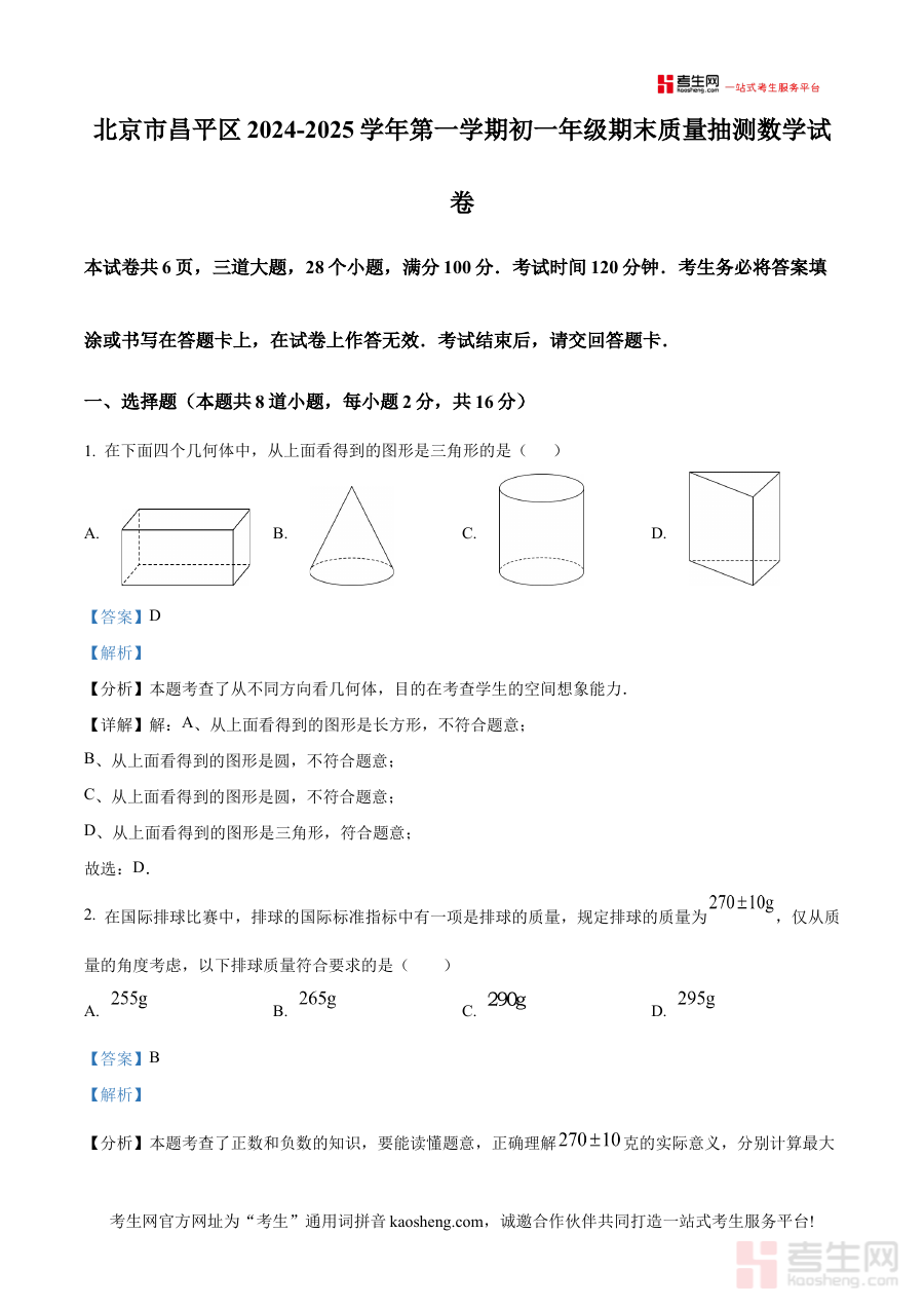 《精品解析:北京市昌平区2024-2025学年上学期七年级期末质量抽测数学试卷(解析版)》是面向北京市昌平区初中七年级学生,针对2024-2025学年第一学期期末质量抽测设计的数学学科备考资料。该资料紧密贴合区域期末抽测的命题导向与评价体系,为学生提供了与实际考试高度匹配的解析内容,助力学生精准把握区域考试的核心要求与考查重点,是衔接课堂学习与期末评估的重要桥梁。