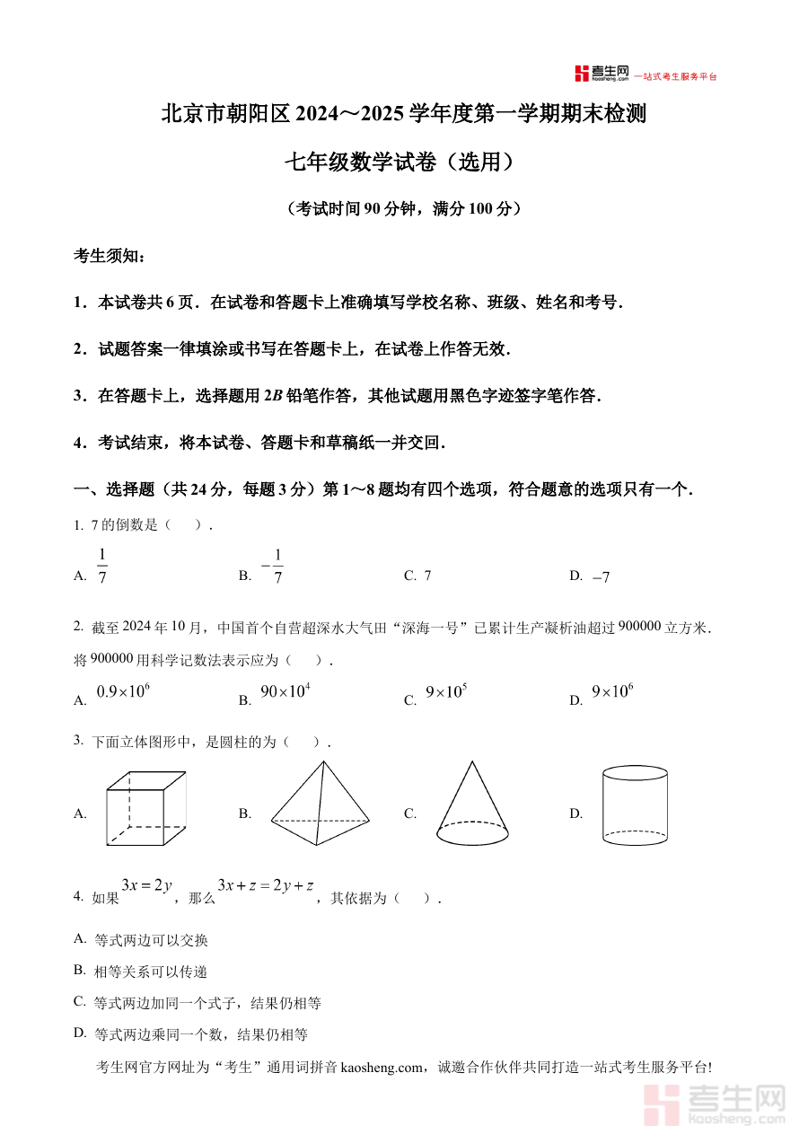 《精品解析:北京市朝阳区2024-2025学年七年级上学期期末考试数学试卷(原卷版)》是针对北京市朝阳区2024至2025学年七年级上学期数学期末考试精心整理的备考资料,严格遵循该地区七年级上学期数学教学大纲与期末考试命题方向,以原卷形式完整呈现考试的结构框架与考查范围,为使用者提供与当地实际期末考试高度契合的练习与参考载体。