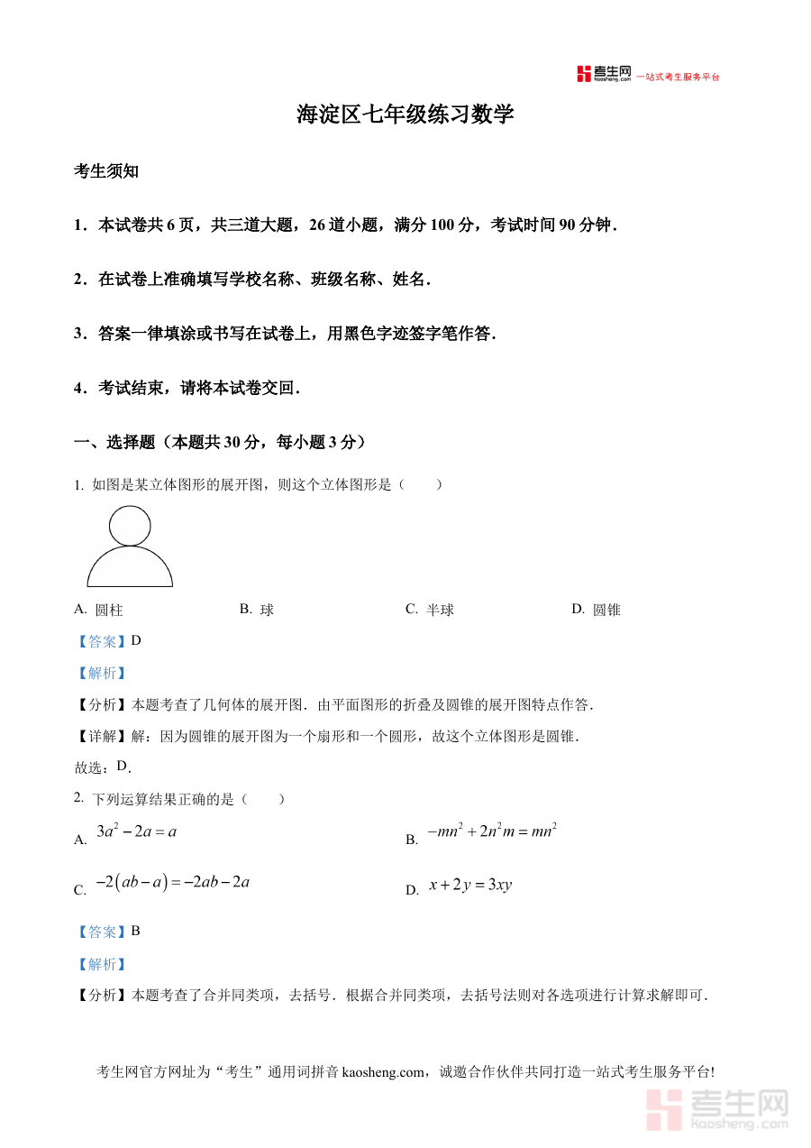 《精品解析:北京市海淀区2024-2025学年七年级上学期期末考试数学试题(解析版)》是针对北京市海淀区2024-2025学年七年级上学期数学期末考试的专业备考资料,聚焦该地区七年级上学期数学期末考的核心考查方向与阶段学习目标,为使用者提供与本地考试高度匹配的解析内容,助力使用者全面了解期末考的相关要求与考查重点,是贴合区域教学实际的优质备考资源。
