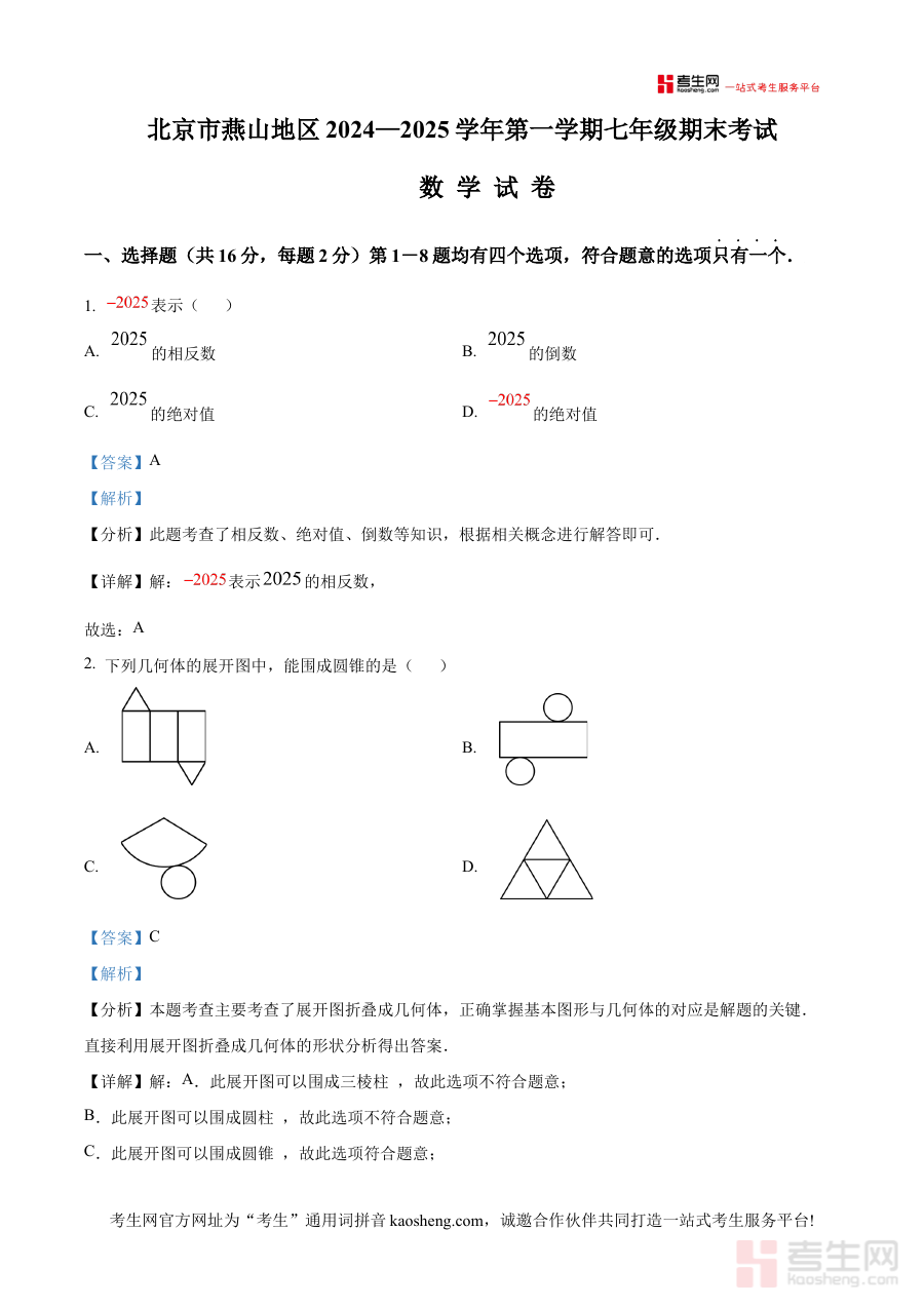 《精品解析:北京市燕山地区2024—2025学年上学期七年级期末考试数学试卷(解析版)》是针对北京市燕山地区2024至2025学年第一学期七年级数学期末考试的专项备考资料,聚焦该地区该学年七年级上学期期末阶段的数学学科考核需求,为使用者提供与本地期末考纲适配的解析内容支撑。