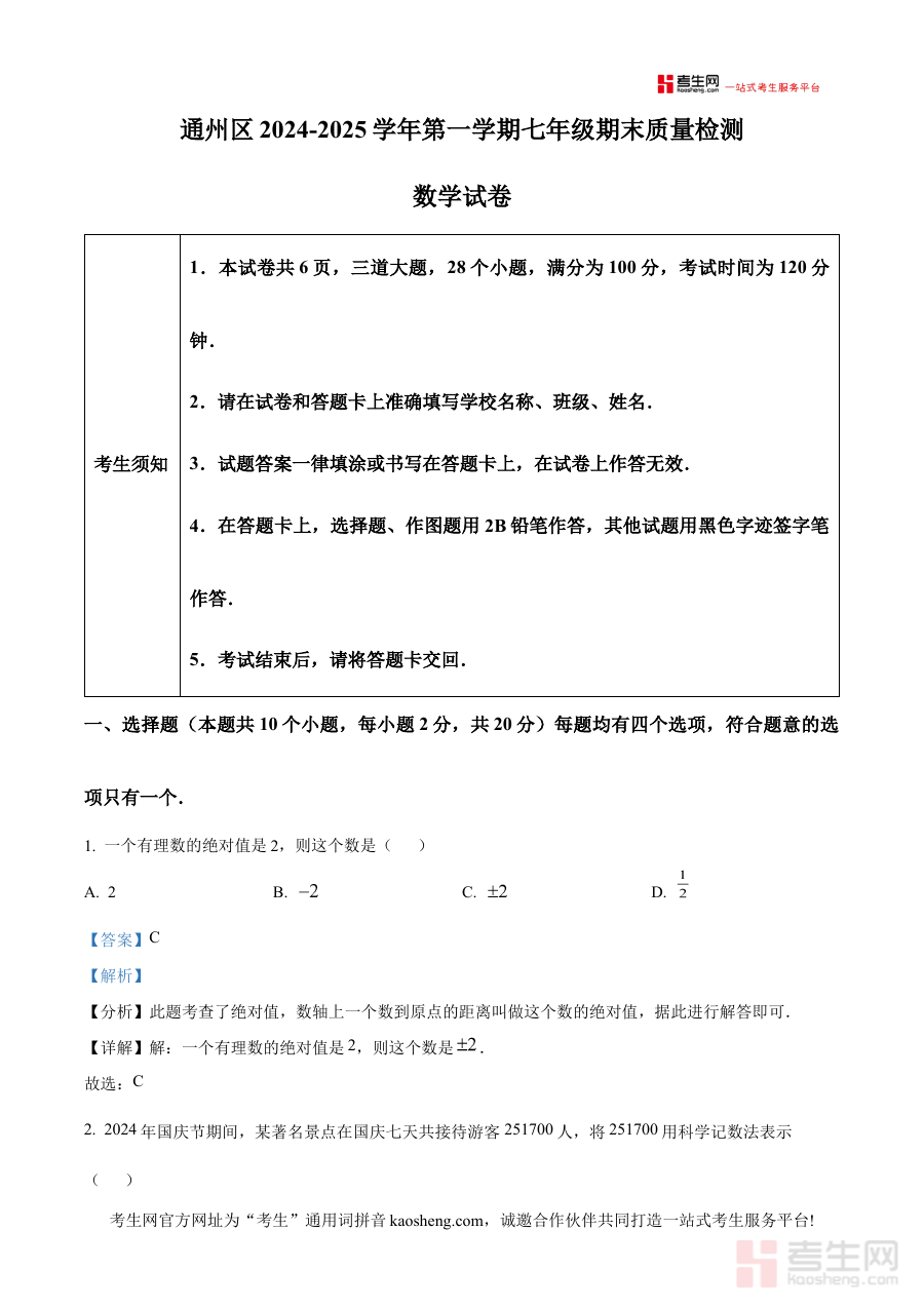 《精品解析:北京市通州区2024-2025学年七年级上期末考试数学试题(解析版)》是针对北京市通州区2024至2025学年第一学期七年级数学期末考试的配套备考资料,聚焦该地区该学年七年级上学期数学期末阶段的学业考查需求,为相关使用者提供专业的解析支持。