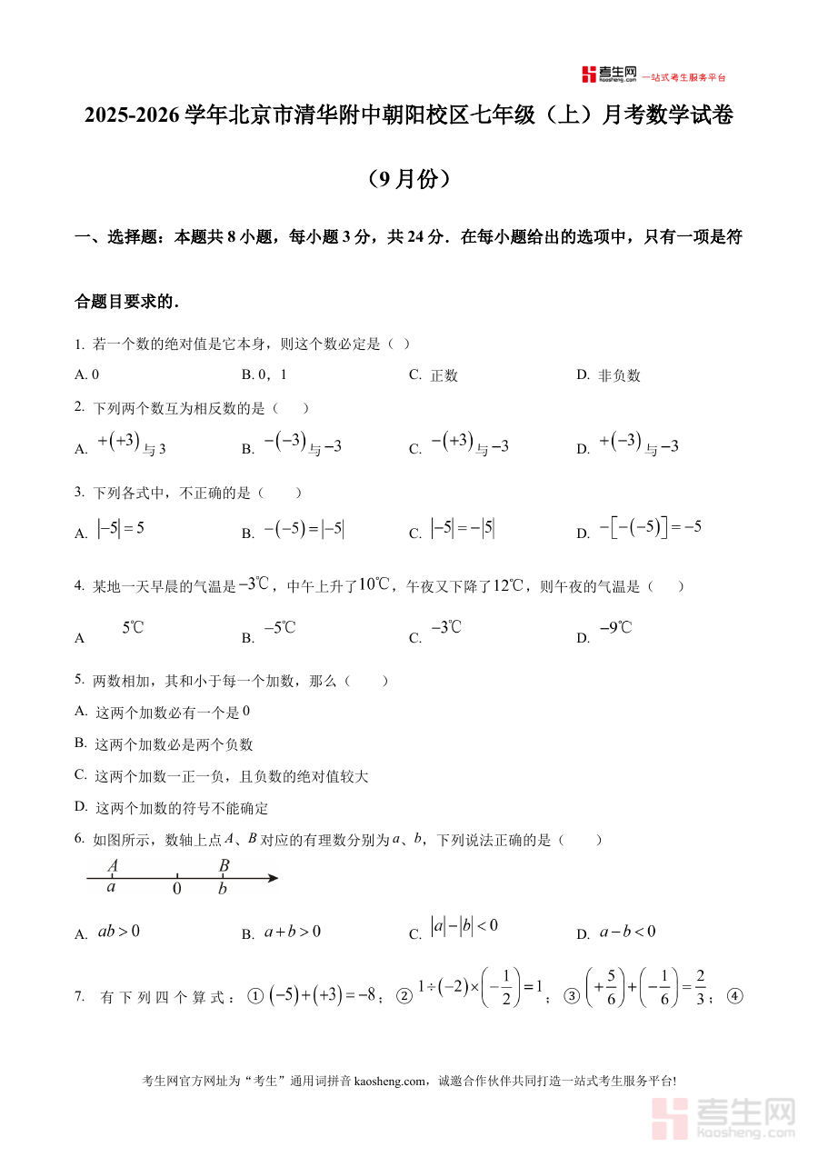 《精品解析:北京市清华附中朝阳校区2025-2026学年七年级上学期月考数学试卷(9月份)(原卷版)》是针对北京市清华附中朝阳校区2025-2026学年七年级学生的9月份月考数学科目的备考资料,聚焦该校区七年级上学期初期阶段的数学学习成果检测需求,为学生提供贴合校区教学进度的考试内容参考。