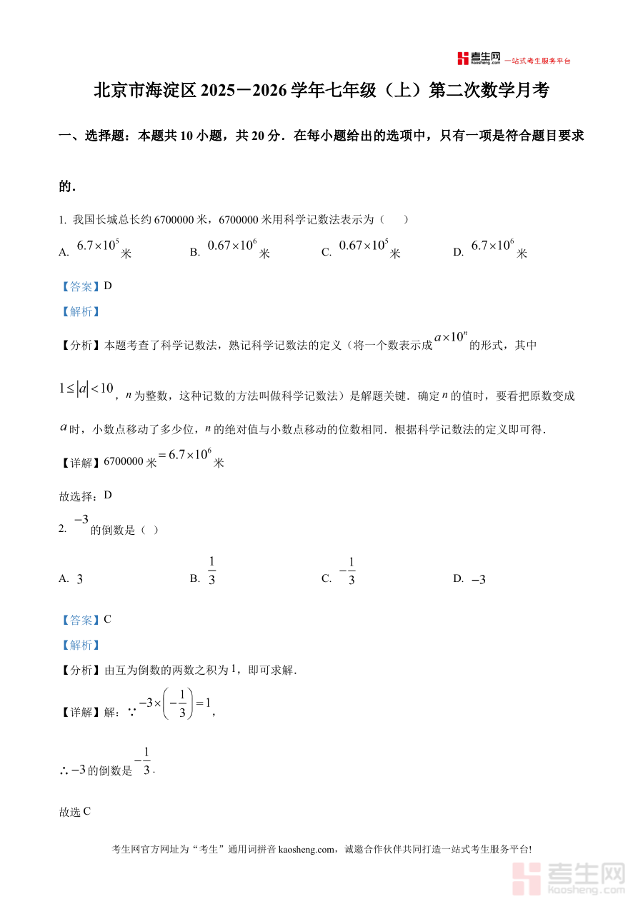 本资料适用于北京市海淀区2025-2026学年七年级学生进行第二次数学月考的考前复习与考后分析,也可为该阶段的数学教师提供教学参考或为家长指导孩子学习提供方向,其解析内容有助于强化学生对阶段性知识的理解与应用能力。