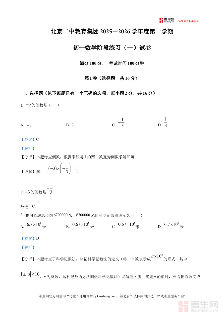 《精品解析:北京市第二中学教育集团2025-2026学年上学期七年级数学阶段练习(一)试卷(解析版)》是针对北京市第二中学教育集团2025-2026学年上学期七年级数学阶段练习(一)的配套解析类备考资料,依托该集团特定学年学期的数学阶段检测场景编制而成。