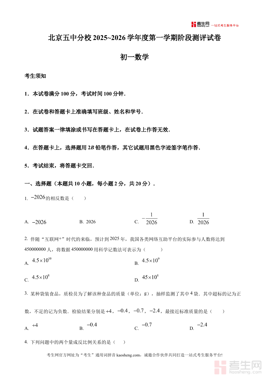 《精品解析:北京市第五中学分校2025-2026学年七年级上学期阶段测评数学试卷(原卷版)》是针对北京市第五中学分校2025至2026学年七年级上学期阶段测评的数学学科原卷资料,聚焦该阶段数学学习的阶段性评估需求,为相关师生提供与实际测评直接关联的备考资源,能够让使用者快速对接本校该学期数学学科的阶段性考查要求,精准把握测评的核心方向与内容范围。