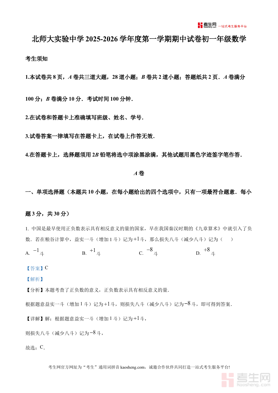 本资料主要适用于北京市北京师范大学附属实验中学2025-2026学年七年级学生,也可为其他同类学校或阶段的数学学习者提供阶段检测的参考范例,其解析内容有助于提升使用者对期中数学考试的应对能力,强化阶段学习效果。
