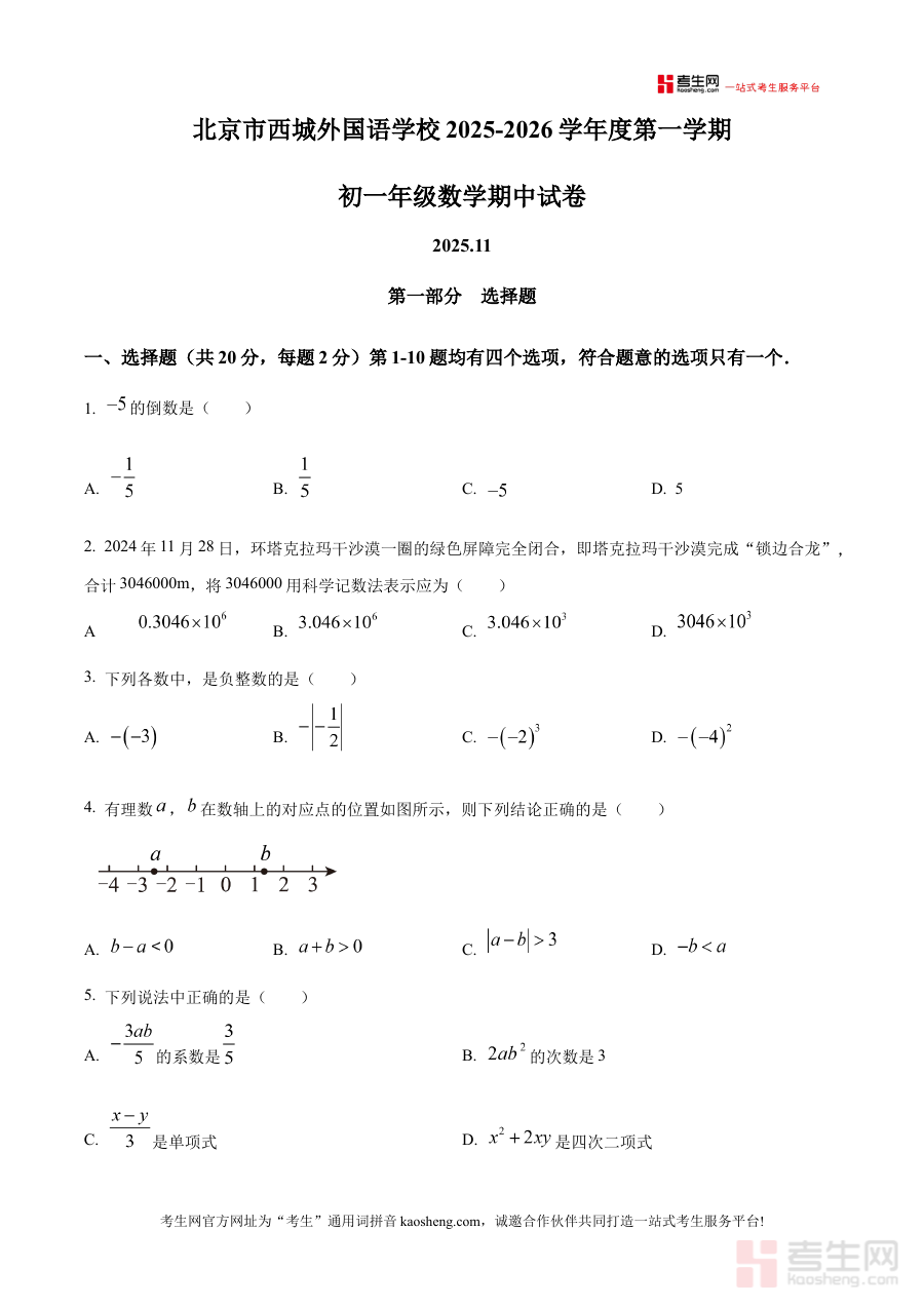 《精品解析:北京市西城外国语学校2025-2026学年上学期七年级数学期中试卷(原卷版)》是针对北京市西城外国语学校2025至2026学年第一学期七年级数学学科期中阶段考试设计的配套备考资料,其核心价值在于呈现该校期中数学考试的原卷内容,帮助对应阶段的学生精准把握校考的命题形式与考查方向,为后续的复习备考提供直接且贴合实际的参考依据。