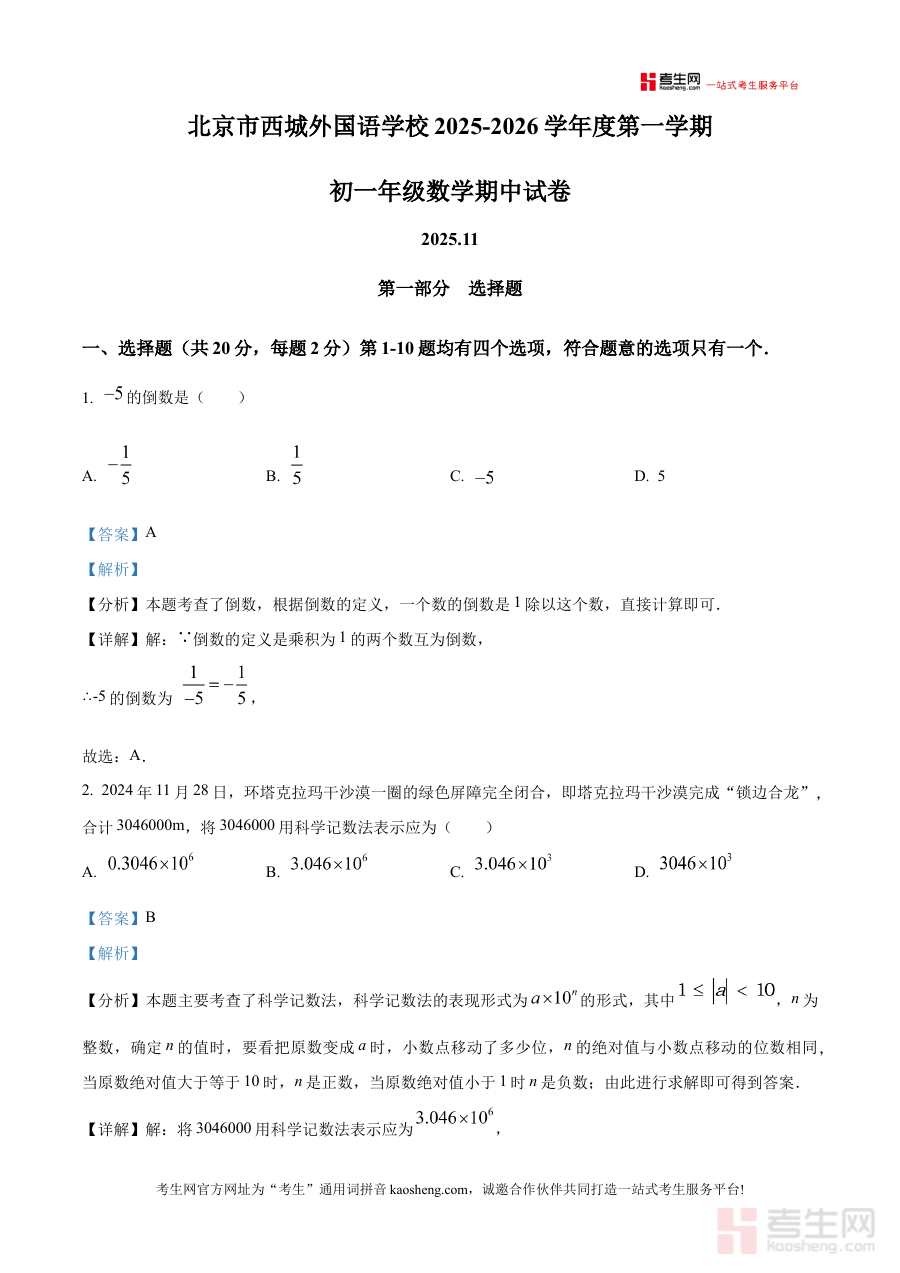 《精品解析:北京市西城外国语学校2025-2026学年上学期七年级数学期中试卷(解析版)》是针对北京市西城外国语学校2025至2026学年七年级上学期数学期中阶段的专属备考资料,紧密贴合该校七年级秋季学期中期的数学教学进度与考核标准,聚焦学生在该阶段的数学学习成果检验需求,为使用者提供与学校实际考核高度匹配的参考内容。