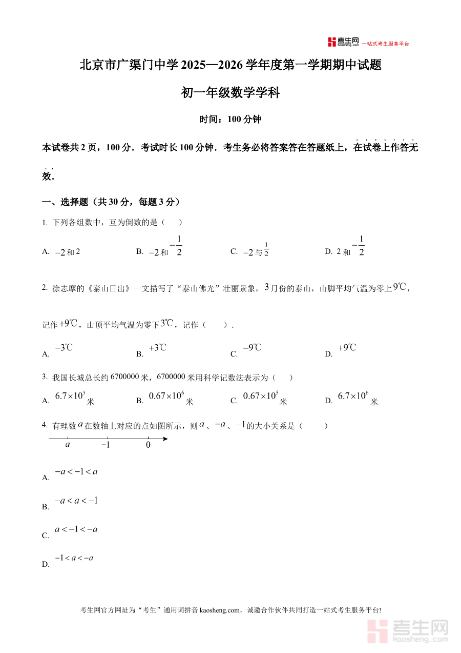 《精品解析:北京市广渠门中学2025-2026学年七年级上学期11月期中考试数学试卷(原卷版)》是针对北京市广渠门中学2025-2026学年七年级学生设计的阶段性考试资料,聚焦该学年上学期11月期中考试的数学学科内容,为学生提供与校内考试直接匹配的原卷形式备考资源。