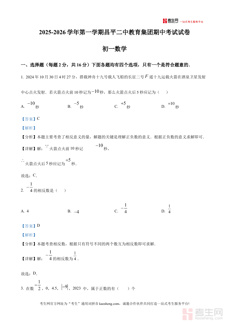 《精品解析:北京市昌平二中教育集团2025-2026学年七年级上学期期中数学试卷 (解析版)》是针对北京市昌平二中教育集团范围内2025-2026学年七年级上学期期中数学考试的配套备考资料,聚焦该阶段数学学科的期中检测需求,为相关使用者提供具有针对性的解析支持。