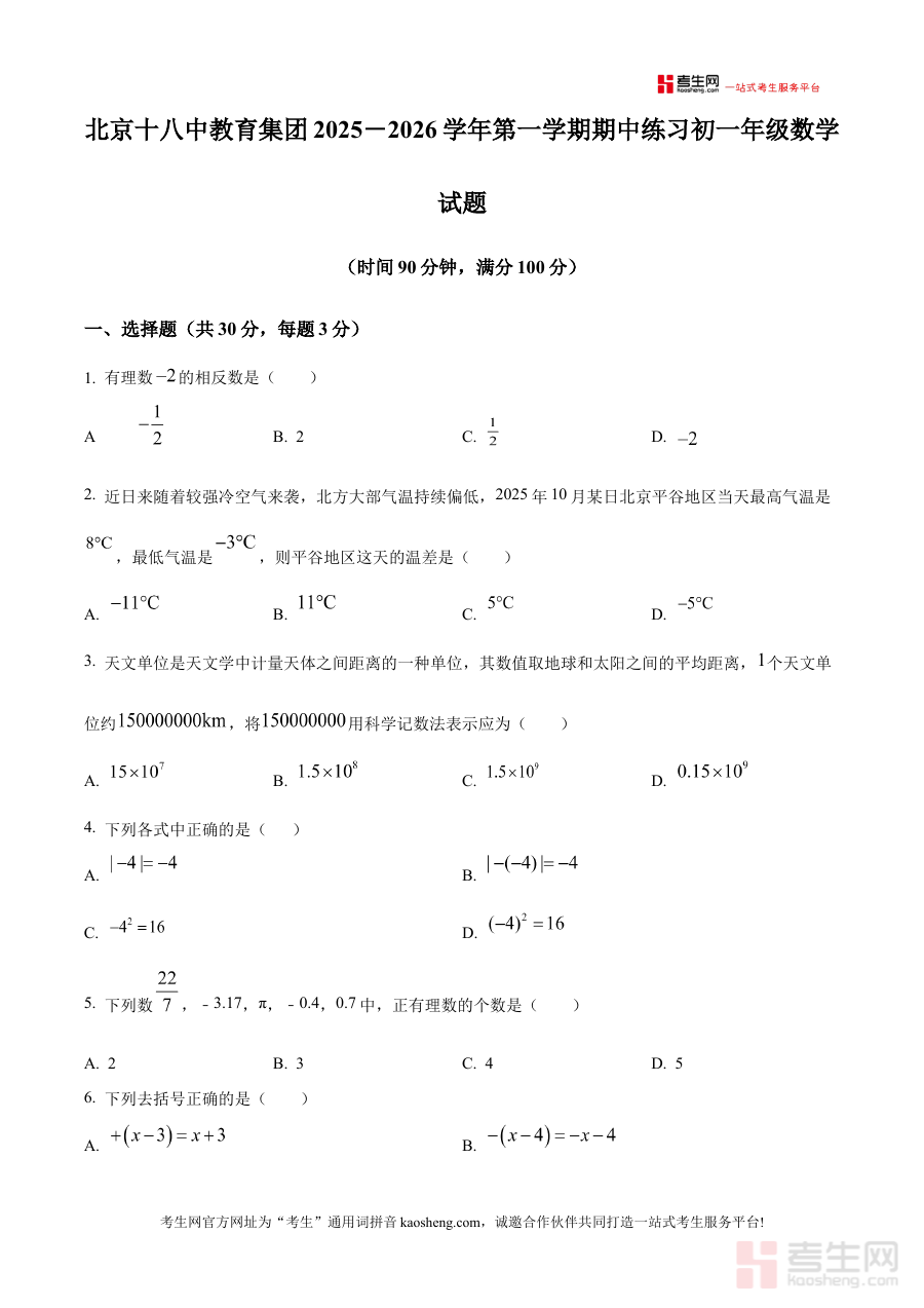 《精品解析:北京市第十八中学2025--2026学年七年级上学期期中数学试卷(原卷版)》是北京市第十八中学针对2025至2026学年七年级上学期期中阶段数学学科的原卷版备考资料,精准对应特定学年、学段、年级及考试类型,为该阶段的数学学习提供了与学校期中考试直接关联的参考载体,能够帮助使用者直观把握该学校该学期七年级期中数学考试的基本样态与命题方向,是获取该阶段考试真实信息的重要资源。