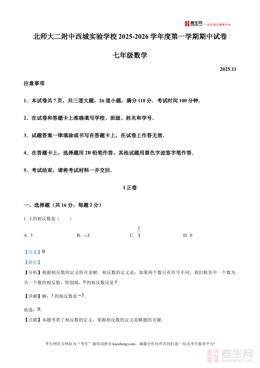 《精品解析:北京市西城区北京师范大学第二附属中学西城实验学校2025--2026学年七年级上学期期中考试数学试卷(解析版)》是针对北京市西城区北京师范大学第二附属中学西城实验学校2025至2026学年七年级上学期数学期中考试的专项备考资料,精准对应该学段该学期的期中检测场景,为相关使用者提供针对性的资源支持。