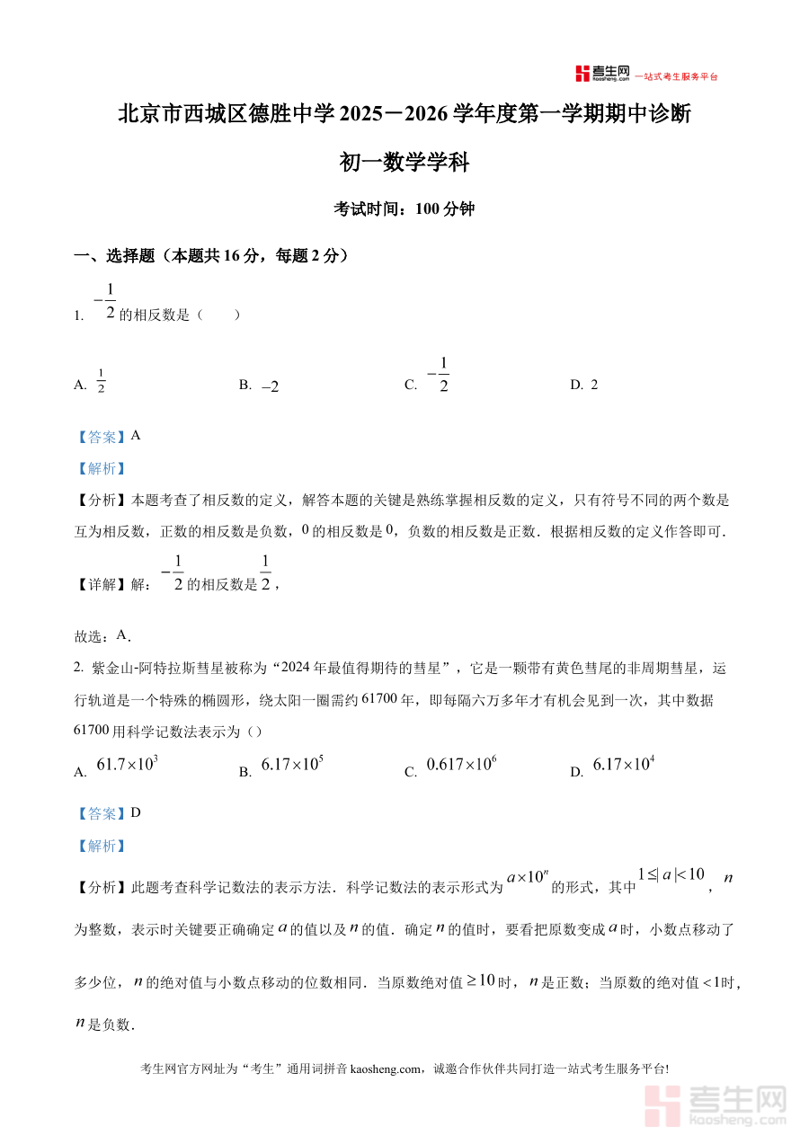 《精品解析:北京市西城区德胜中学2025-2026学年七年级上学期期中考试数学试卷(解析版)》是针对北京市西城区德胜中学特定学年七年级上学期期中考试数学科目的专业备考资料,精准匹配该校该阶段的数学教学进度与考试要求,为学生提供贴合校考实际的复习支持,帮助学生提前熟悉本校期中数学考试的考查逻辑与方向。