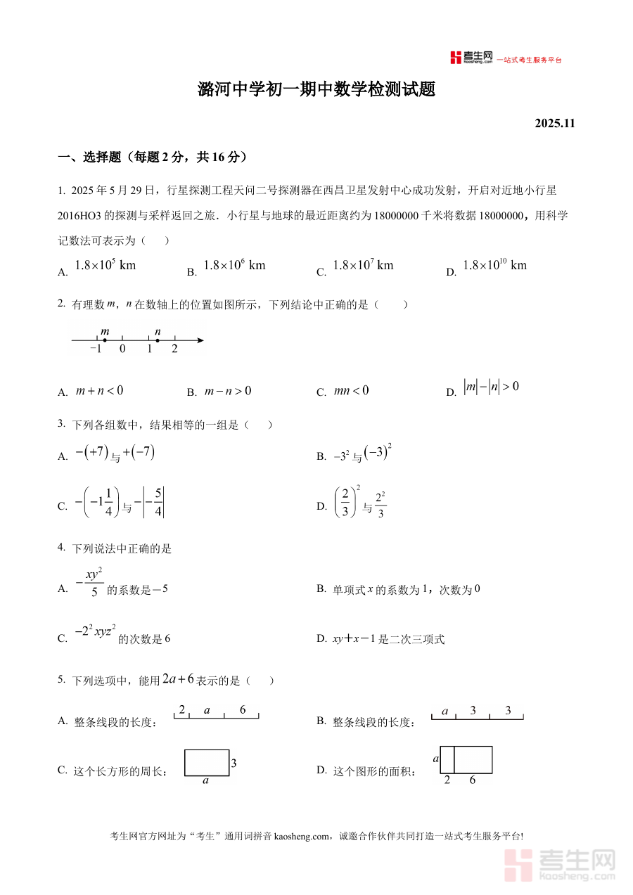 《精品解析:北京市通州区潞河中学2025-2026学年七年级上学期期中数学试卷(原卷版)》是针对北京市通州区潞河中学2025至2026学年七年级学生设计的期中数学考试原卷资料,贴合该学年上学期的教学进度与期中检测要求,为学生提供与校内考试直接相关的备考依据。