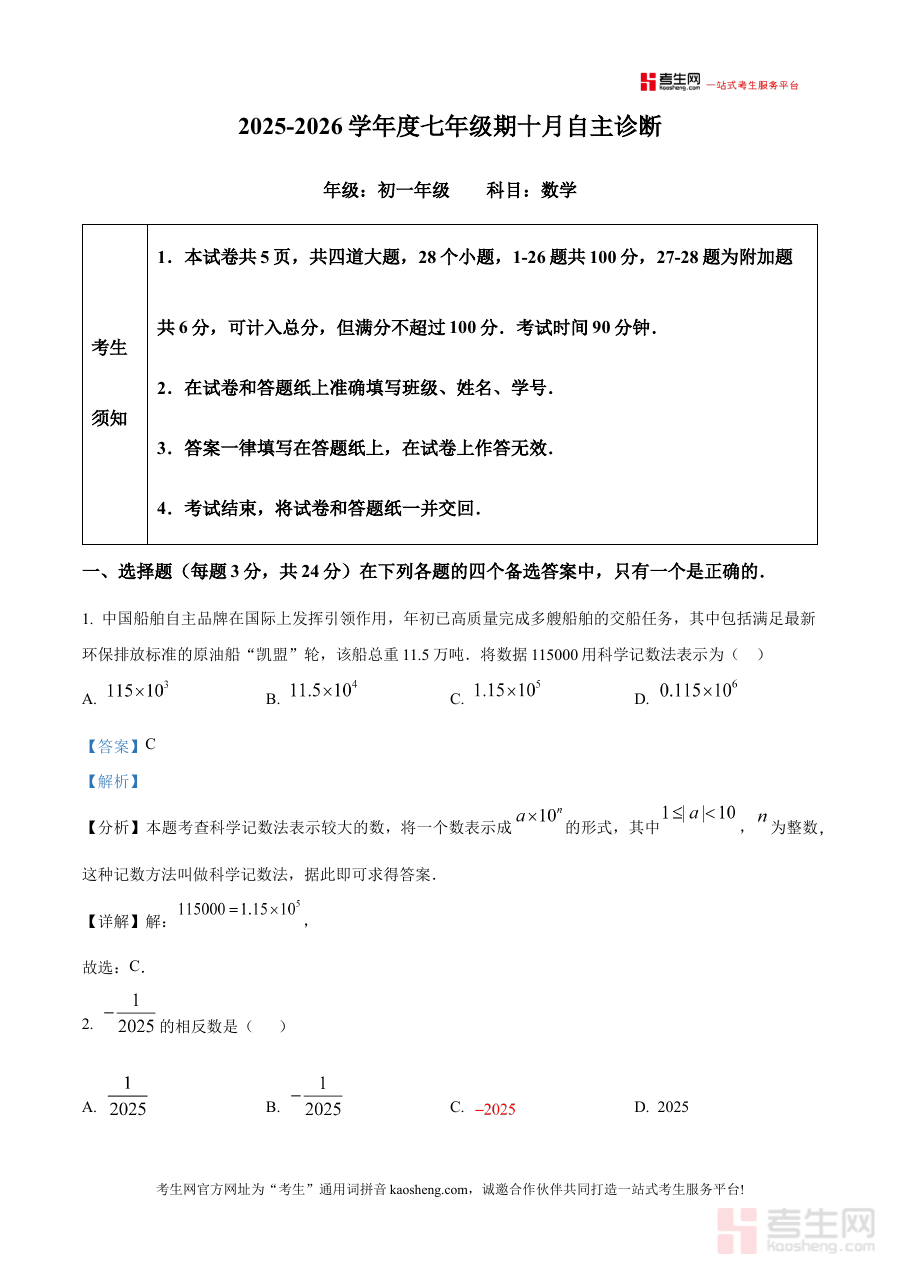 《精品解析:北京市陈经纶中学2025-2026学年七年级上学期数学期中自主诊断试卷(解析版)》是针对北京市陈经纶中学2025-2026学年七年级上学期数学学科期中阶段自主诊断考试的备考资料,紧密贴合校内该阶段的数学学习评估需求,为使用者提供与学校考试体系匹配的参考内容。