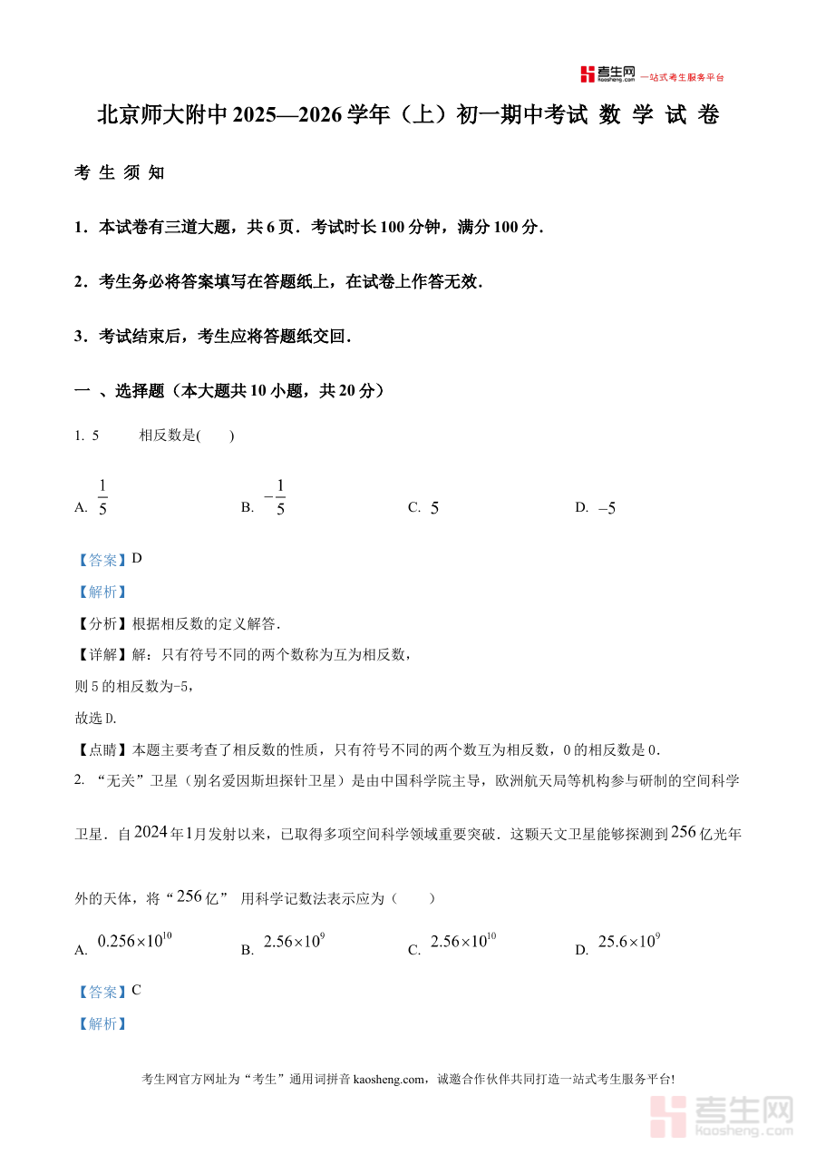 《精品解析:北京师范大学附属中学2025-2026学年上学期七年级期中考试数学试卷(解析版)》是北京师范大学附属中学针对2025至2026学年上半学期七年级学生数学学科期中考试推出的解析类备考资料,涵盖该阶段期中考试的核心考查范畴,为学生和教师提供了与学校期中检测直接相关的参考内容,有助于使用者快速把握本次期中考试的整体框架和考查方向,是贴合该校七年级数学教学进度与检测要求的针对性资料。