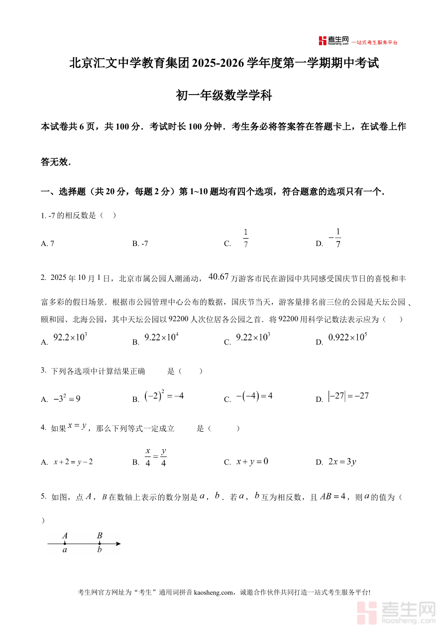 《精品解析:北京汇文中学教育集团2025--2026学年七年级上学期期中数学试卷(原卷版)》是针对北京地区汇文中学教育集团2025至2026学年七年级上学期期中数学考试的备考资料,聚焦该阶段数学学科的期中检测需求,为使用者提供贴合本地教育集团教学进度与考试标准的参考素材。