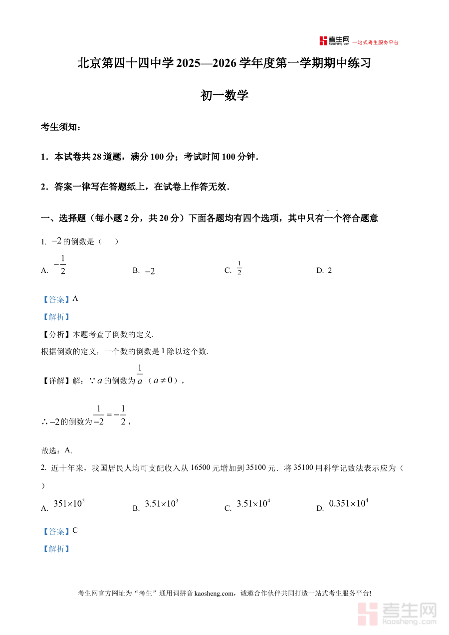 《精品解析:北京第四十四中学2025-2026学年上学期期中考试七年级数学试题(解析版)》是针对北京第四十四中学2025至2026学年上学期七年级数学期中考试的配套备考资料,聚焦该阶段学校内部期中检测的特定需求,为相关使用者提供具有针对性的解析支持。