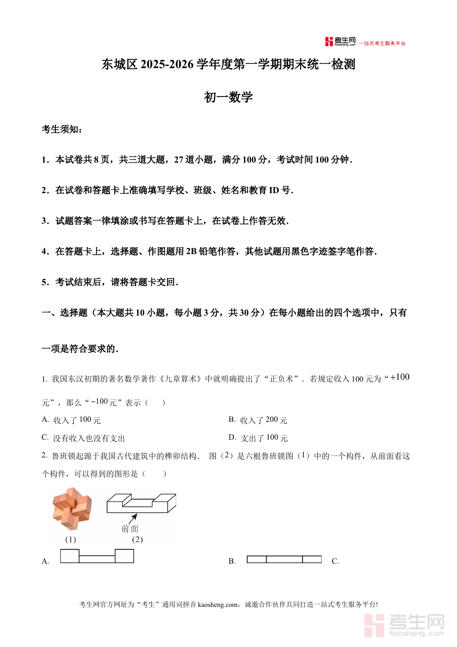 《精品解析:北京市东城区2025-2026学年七年级上学期期末数学试卷(原卷版)》是针对北京市东城区2025至2026学年七年级上学期期末数学考试的专项备考资料,聚焦该地区七年级学生在学期末阶段的数学学习成果检测需求,依托东城区本地教学进度与考试命题特点设计,为学生提供贴合区域实际的备考支持。