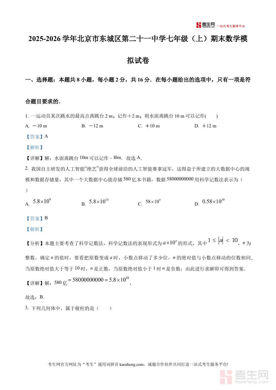 本资料主要适用于北京市东城区第二十一中学该学年上学期的七年级学生,也可供该学校数学教师参考使用,其解析版的设计能让学生在练习后及时获取详细解答思路,强化对知识点的理解与应用能力,对提升期末备考效率和阶段学习质量具有重要价值。