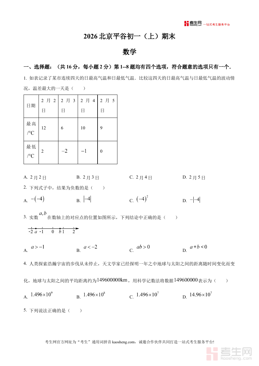 《精品解析:北京市平谷区2025-2026学年上学期七年级数学期末试题(原卷版)》是聚焦北京市平谷区2025至2026学年第一学期七年级数学学科期末检测的标准化原卷备考资料,严格遵循该区域该学年七年级数学教学大纲与期末考查要求编制,完整还原当地期末考试的试题结构与呈现形式,为使用者提供与真实考试高度一致的练习载体。