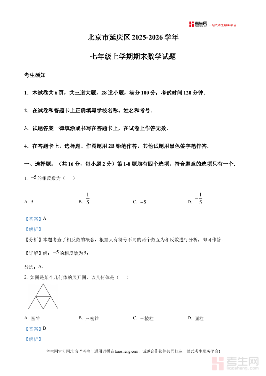 《精品解析:北京市延庆区2025-2026学年七年级上学期期末数学试题(解析版)》是针对北京市延庆区2025至2026学年七年级上学期数学期末测试的配套解析类备考资料,聚焦该区域七年级学生本学期数学学习成果的综合评估需求,为学生提供与本地期末考纲匹配的专业解析支持。