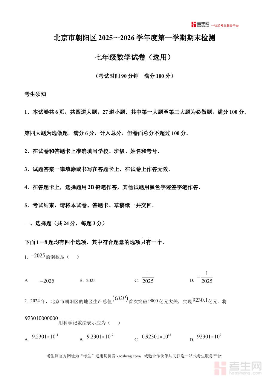 《精品解析:北京市朝阳区2025~2026学年上学期七年级期末数学试卷(原卷版)》是针对北京市朝阳区2025至2026学年上学期七年级期末数学考试的专用备考资料,精准对应该地区该学段的期末测评场景,为学生提供与本地考试体系匹配的原卷内容参考。