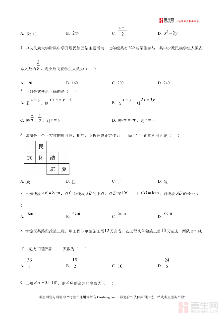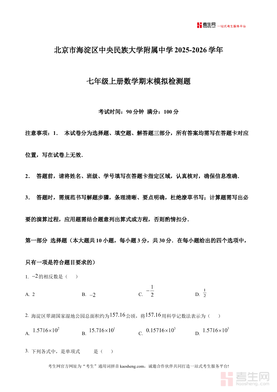 本资料主要适用于北京市海淀区中央民族大学附属中学2025-2026学年上学期的七年级学生,也可供该学段数学教师作为教学辅助工具使用,通过模拟检测的形式助力学生巩固阶段知识,优化备考策略,为期末取得理想成绩奠定基础。