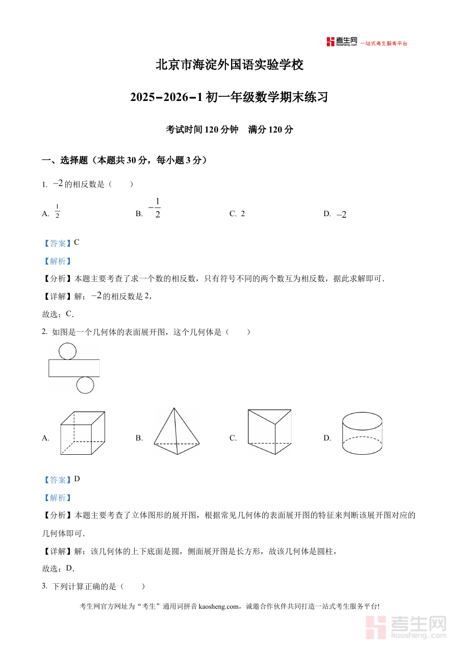 《精品解析:北京市海淀外国语实验学校2025--2026学年七年级上学期期末数学试卷(解析版)》是针对北京市海淀外国语实验学校2025至2026学年七年级上学期期末数学考试的专属备考资料,精准对接该校该阶段数学学科的期末检测场景,为使用者提供与学校期末考高度匹配的解析内容。