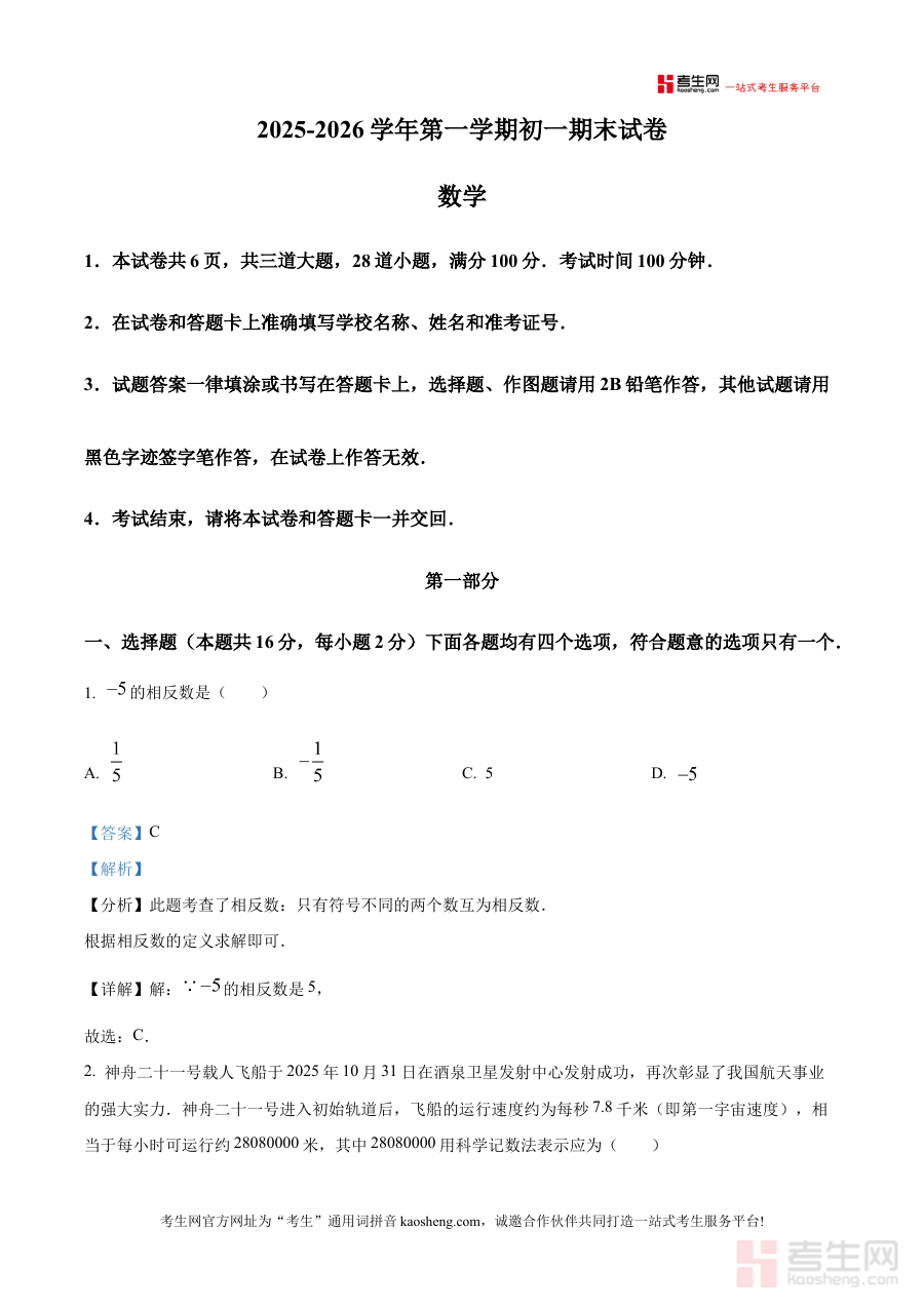 《精品解析:北京市石景山区2025-2026学年七年级上学期期末数学试卷(解析版)》是针对北京市石景山区2025至2026学年七年级上学期数学期末检测的配套备考资料,聚焦该地区七年级上学期数学学科的期末考核需求,为使用者提供与本地教学进度及考试要求相匹配的参考内容。