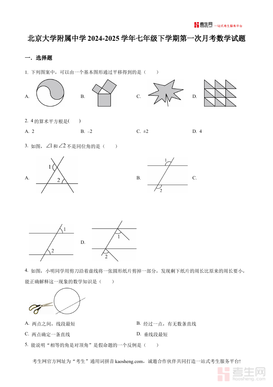 《精品解析:北京大学附属中学2024-2025学年 七年级下学期第一次月考数学试题(原卷版)》是2024-2025学年北京大学附属中学针对七年级下学期数学学科第一次月考设计的备考资料,聚焦该阶段数学学习的阶段性考查需求,为相关学习与教学活动提供原卷形式的参考依据。