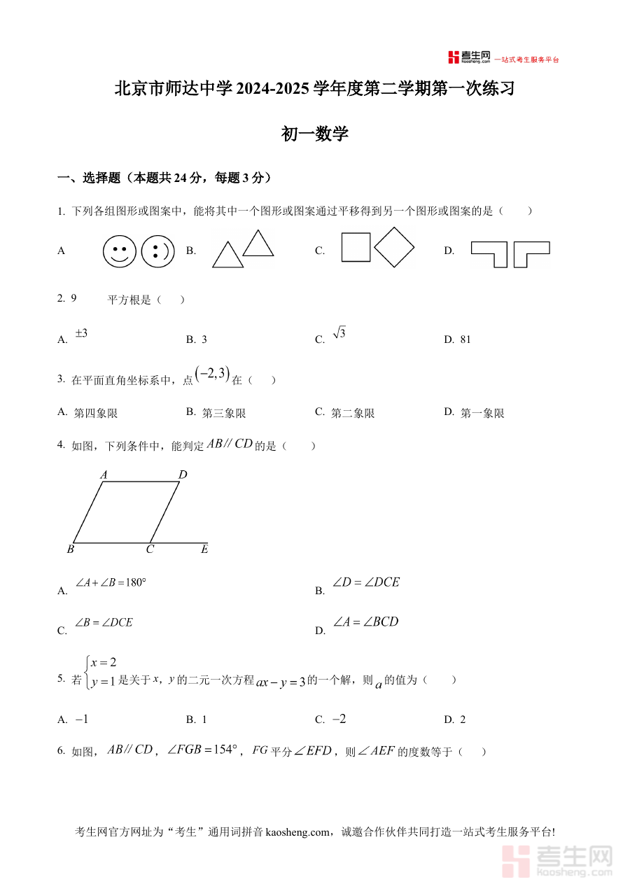 《精品解析:北京市海淀区师达中学2024~2025学年下学期七年级数学第一次练习(3月考)(原卷版)》是北京市海淀区师达中学在2024至2025学年下学期针对七年级学生组织的数学第一次阶段性练习(3月考)的原卷版本备考资料。该资料严格匹配学校本学期七年级数学学科的阶段性教学进度,以原卷形式还原考试场景,为学生提供与实际考试高度一致的练习载体,帮助学生提前适应学校月考的内容呈现方式。