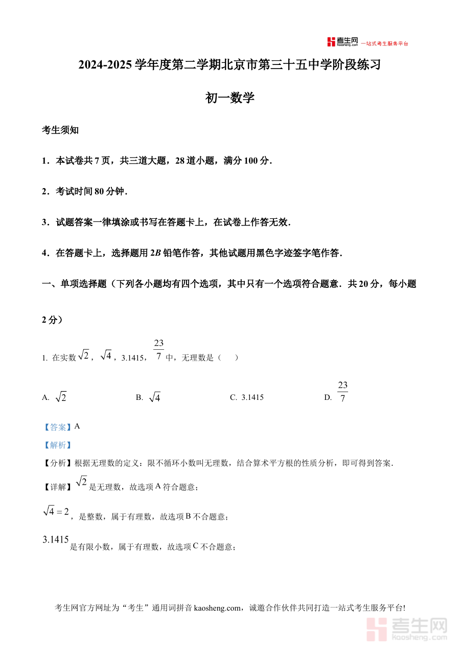 《精品解析:北京市第三十五中学2024-2025学年下学期七年级3月月考数学试卷(解析版)》是针对北京市第三十五中学2024-2025学年下学期七年级学生3月数学月考的专项备考资料,紧密贴合该学年下学期阶段性学习进度,能够精准匹配此阶段学生的数学学习需求与考试方向。