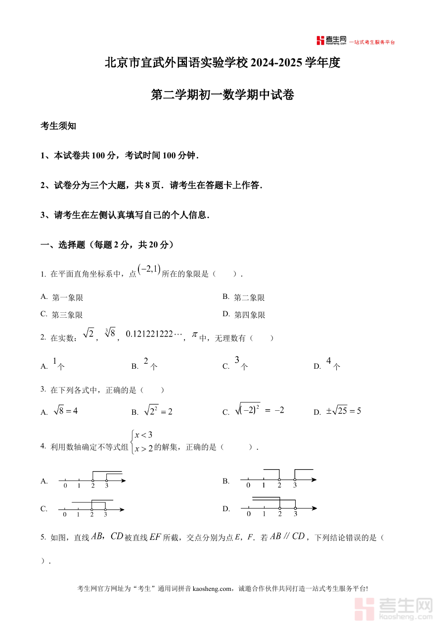 《精品解析:北京市宣武外国语实验学校2024-2025学年七年级下学期数学期中试卷 (原卷版)》是北京市宣武外国语实验学校在2024至2025学年第二学期针对七年级学生数学学科推出的期中检测原卷资料,属于该阶段数学学科期中备考的重要参考材料,能够为学生和教师提供贴合学校教学实际的期中检测样本,反映该学校七年级数学教学的阶段性考查方向与要求。