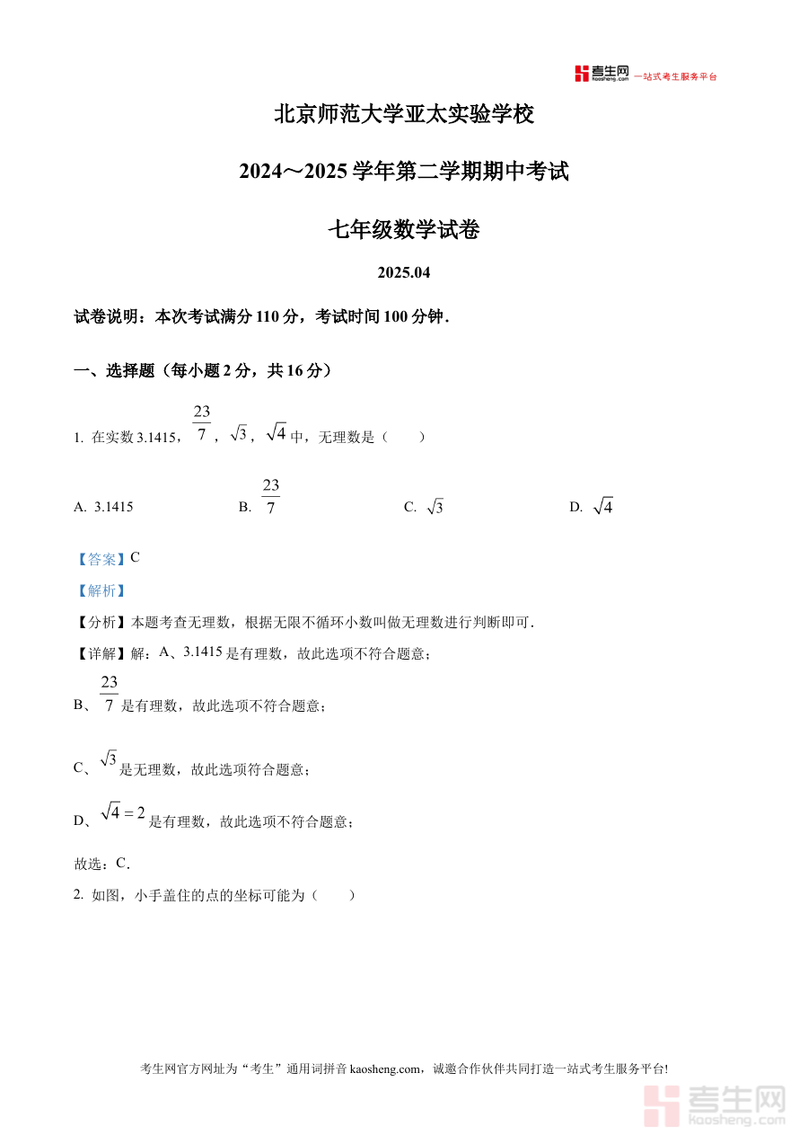 《精品解析:北京师范大学亚太实验学校 2024~2025 学年下学期期中考试 七年级数学试卷(解析版)》是针对北京师范大学亚太实验学校2024至2025学年下学期七年级数学期中考试的备考资料,聚焦该阶段数学学科的阶段性考查需求,为相关师生提供专业的解析参考依据。